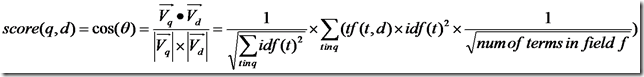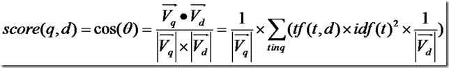 然后,有Lucene学习总结之一:全文检索的基本原理中的描述我们知道,Lucene的打分机制是采用向量空间模型的: