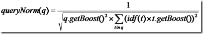 queryNorm(q):计算每个查询条目的方差和,此值并不影响排序,而仅仅使得不同的query之间的分数可以比较。其公式如下: