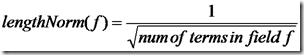 - lengthNorm(field) = (1.0 / Math.sqrt(numTerms)):一个域中包含的Term总数越多,也即文档越长,此值越小,文档越短,此值越大。