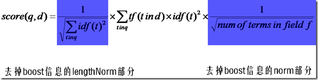 在默认状况下,Lucene采用DefaultSimilarity,认为在计算文档的向量长度的时候,每个Term的权重就不再考虑在内了,而是全部为一。