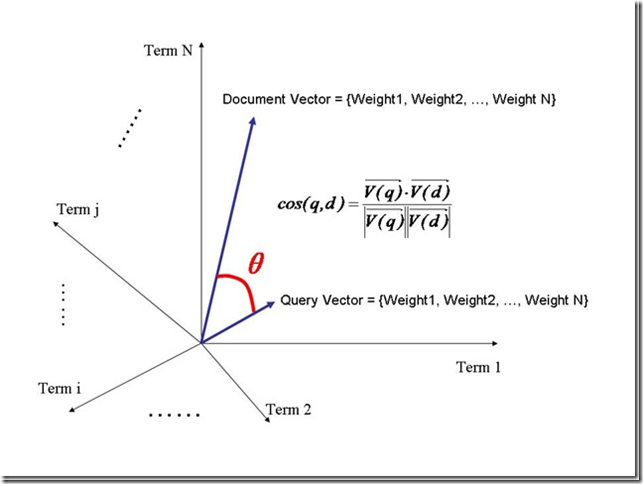 我们把所有搜索出的文档向量及查询向量放到一个N维空间中,每个词(term)是一维。