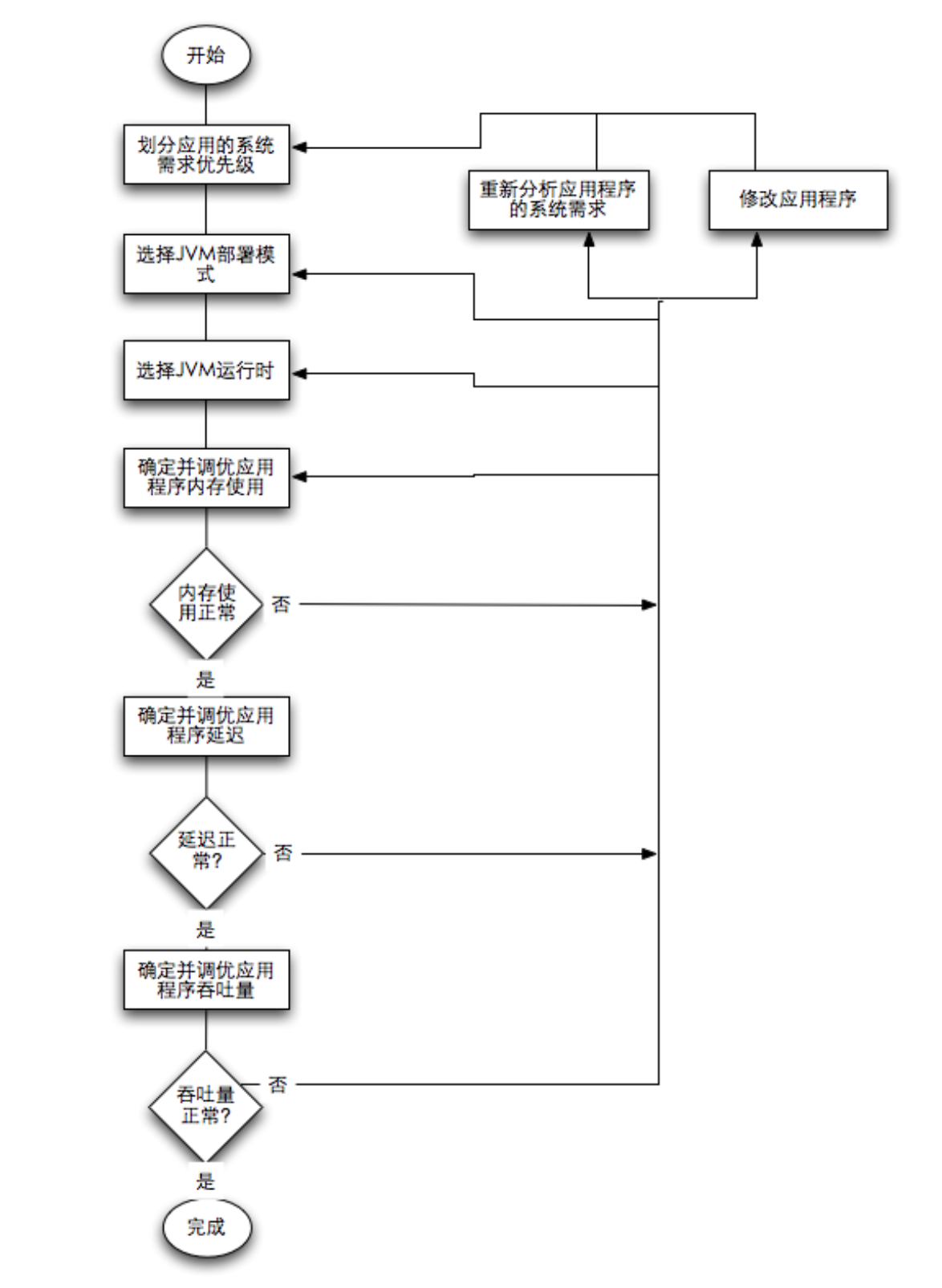 吞吐量是对单位时间内处理工作量的度量,设计吞吐量需求时,一般不考虑它对延迟或响应时间的影响.通常情况下,增加吞吐量的代价是延迟的增加或内存使用的增加.吞吐量性能的需求的一个典型例子是:应用程序每秒需要完成2500次事务.延迟及响应性是对引用程序收到指令开始工作直到完成该工作所消耗时间的度量.通常情况下,提高响应性的代价是更低的吞吐量,或者更多的内存消耗.延迟需求的一个典型例子是应用程序应该在60ms内完成请求的处理工作内存占用是指在同等程度的吞吐量,延迟,可用性等前提下,运行应用程序所需要的内存大小.内存占用通常以运行应用程序需要的JAVA堆大小或运行应用程序所需要的总大小来表述.一般情况下可以通过增大JAVA堆的方式增加内存能够提高吞吐量,降低延迟.
