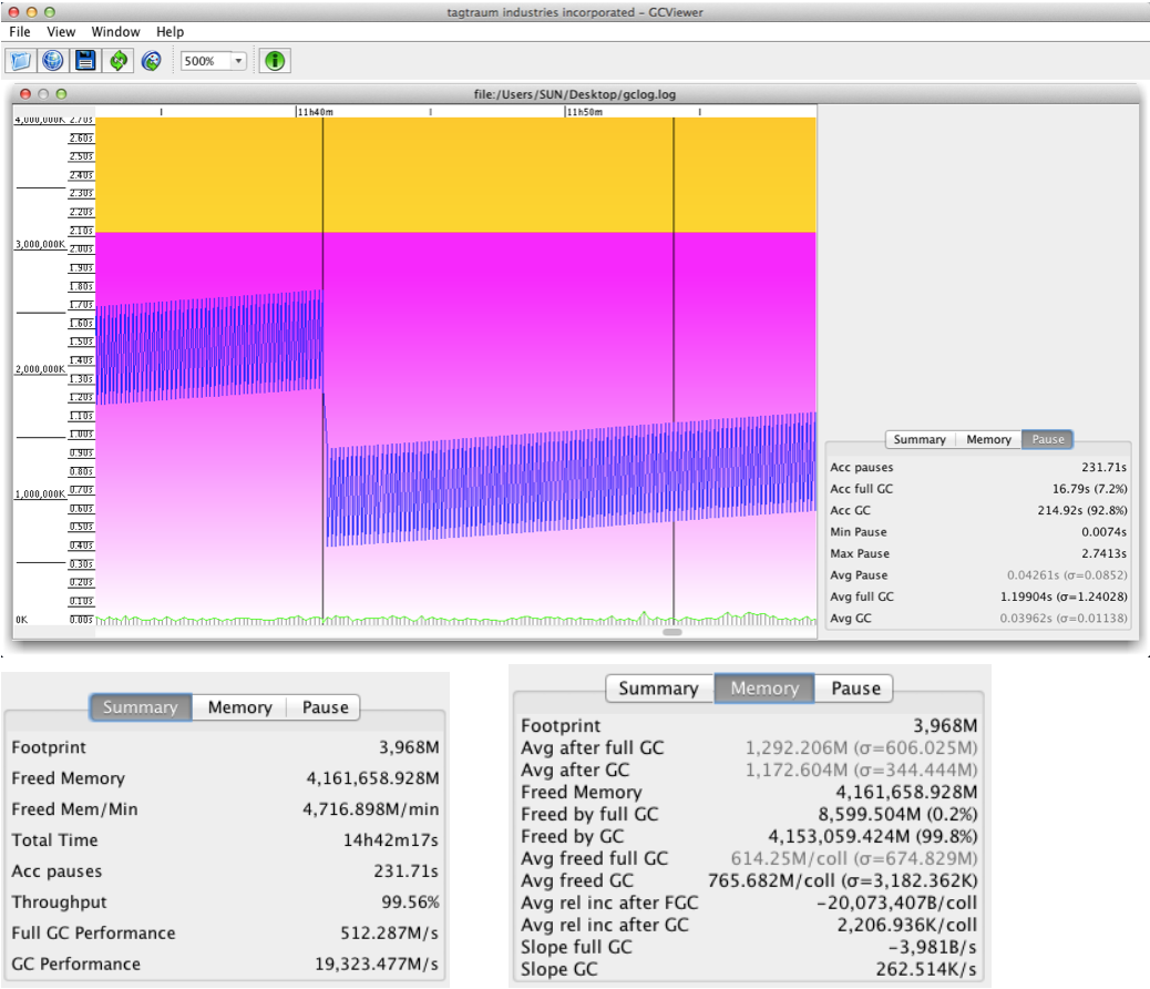 系统运行52937秒,整个GC暂停时间231.71秒. 系统可用时间 99.56%.平均GC时间0.039秒,最大停顿时间2.7秒.达到系统要求.