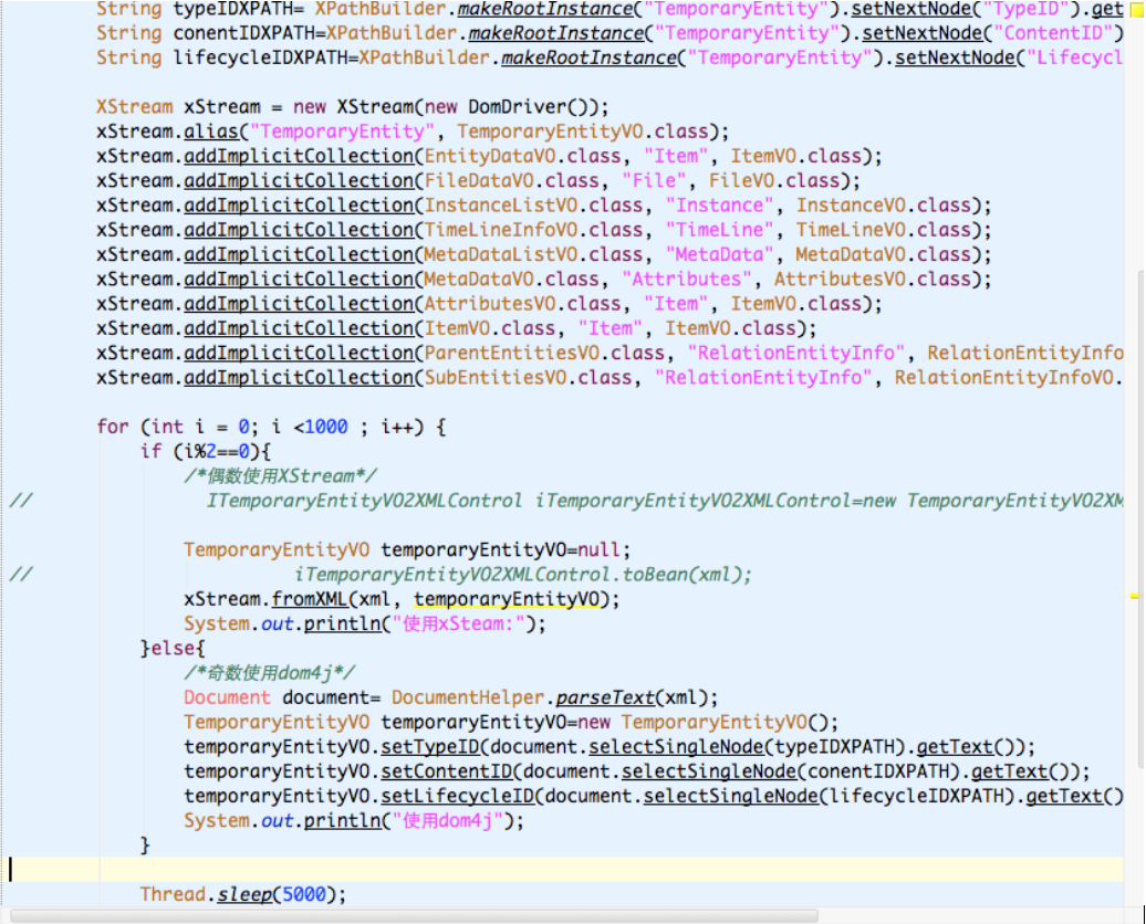 该断代码的逻辑在于读取一个临时实体的XML字符串. 然后不断的循环,一次采用XStream来反序列化生成临时实体对象,一次采用Dom4j来生成临时实体对象.两种方式交替执行.每次执行停顿5000毫秒.该代码执行后,通过jstat分析得出,每当使用XStream生成临时实体的时候Perm区都会增长0.5%左右.而使用Dom4j不会(如果使用Dom4j的XPATH功能,会增长0.1左右).由此可以断定应该是Xstream在反序列化XML生成对象的过程中产生了动态的代理Class.造成了perm区的增加.根据网上查到的说法,