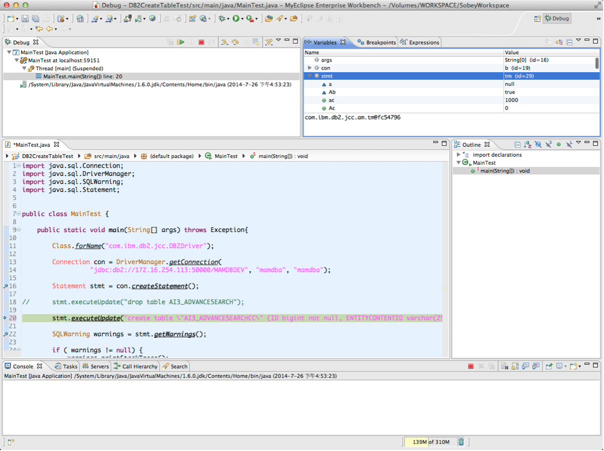 7.再一次重启DB2和DCMP,并断点到执行建表语句的位置. 这次直接把内存中的SQL语句给更改了.改成:
