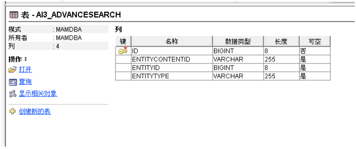 建表语句:1create table "AI3_ADVANCESEARCH" (ID bigint not null,ENTITYCONTENTID varchar(255),ENTITYID bigint,ENTITYTYPE varchar(255),rEvtl varchar(255),primary key (ID))