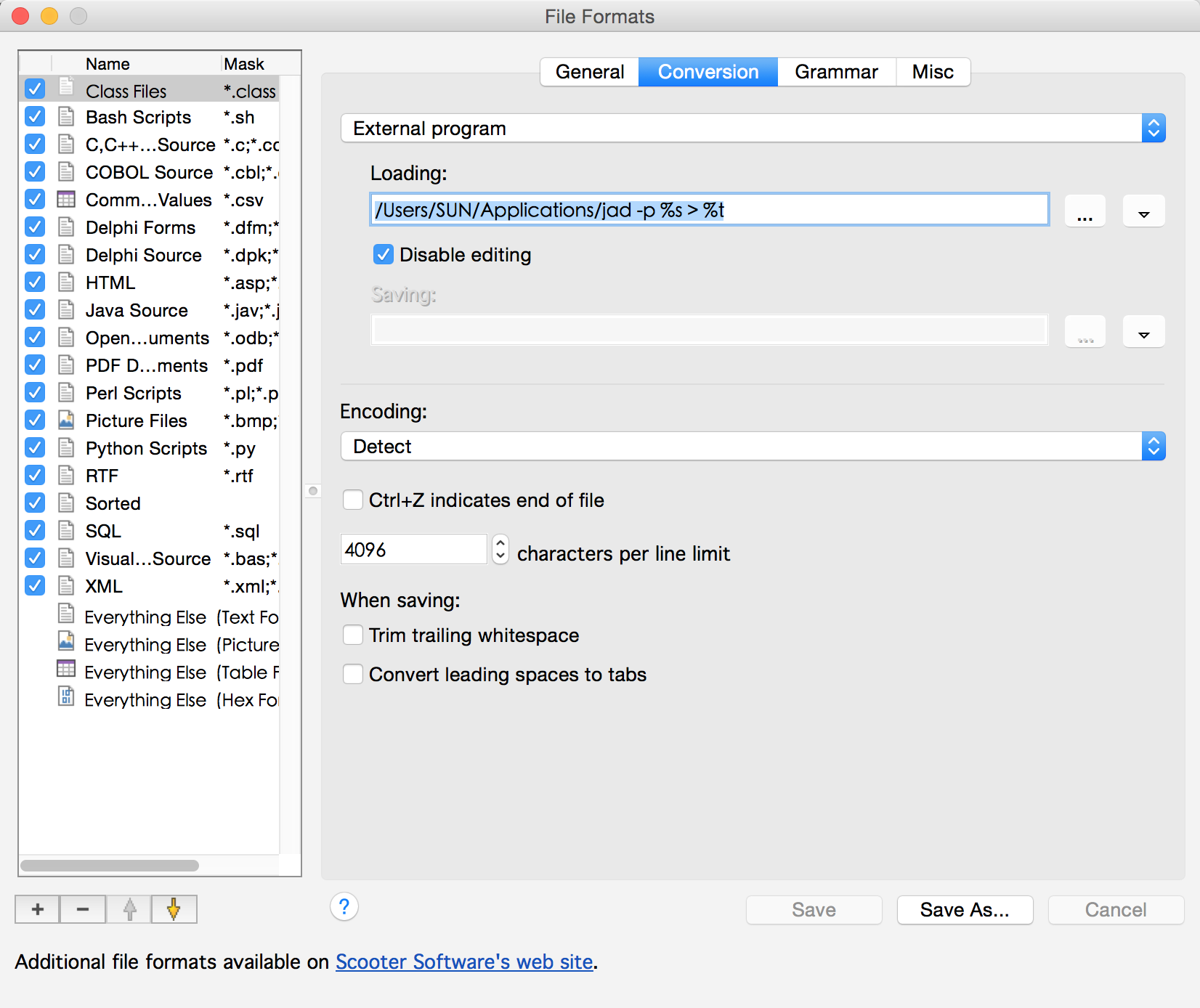 general里面 过滤格式 输入*.class Conversion里面 选择External Program.Loading里面输入had -p %s >%t- 选择上