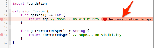 下面就是在我们不明确的声明添加什么访问修饰的前提下,来看扩展会是一个什么反应(为了能访问私有属性变量和方法,我在Person.swift里定义了这个扩展):