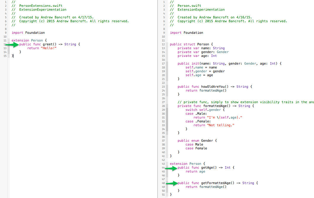 也就是说,没有必要写public extension Person {...}。因为Person已经是public了,所以基于Person的扩展也就很自然的延用了类型本身的访问等级。