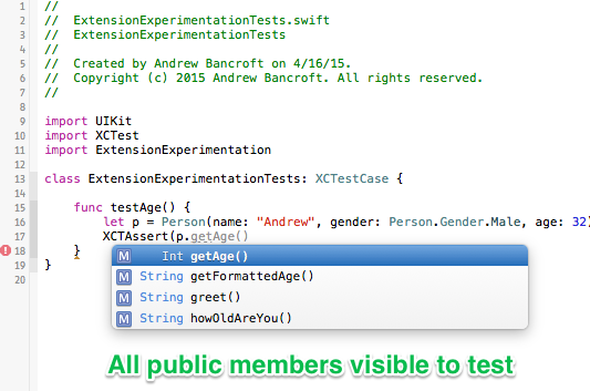 像上面这段代码用默认的访问修饰符时就会允许在同一个模块中的实例访问扩展里的API。但是,如果被扩展的类型的实例是在另一个模块(比如在测试模块),则无法访问扩展中任何新增的公共API。