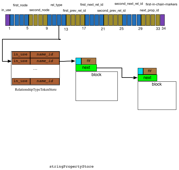 关系的类型的字符串描述值是存在StringPropertyStore这样的DynamicStore 中,如果长度超过一个block ,则分block存储,并将其在StringPropertyStore中的第1个block 的 block_id 保存到 RelationshipTypeTokenStore类型文件相应record 的name_id字段中。