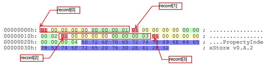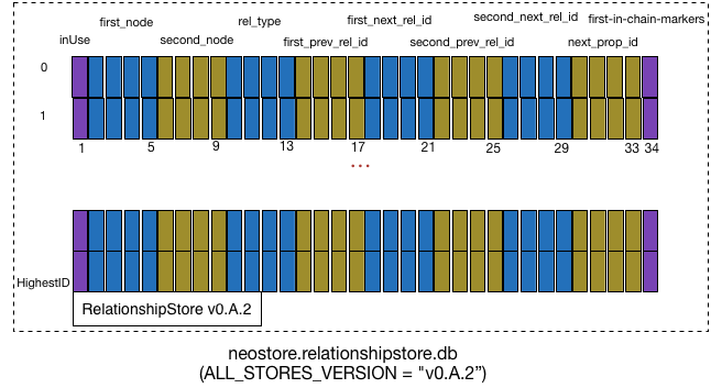 first_prev_rel_id(4 Bytes): 第14~17字节是from_node 的排在本RelationShip 前面一个RelationShip的 relationship_id 的低32位. 加上rel_type的第 26~28 bit 作为高3位,构成一个完整的35位relationship_id。first_next_rel_id(4 Bytes): 第18~21字节是from_node 的排在本RelationShip 前面一个RelationShip的 relationship_id 的低32位. 加上rel_type的第 23~25 bit 作为高3位,构成一个完整的35位relationship_id。second_prev_rel_id(4 Bytes): 第22~25字节是from_node 的排在本RelationShip 前面一个RelationShip的 relationship_id 的低32位. 加上rel_type的第 20~22 bit 作为高3位,构成一个完整的35位relationship_id。second_next_rel_id(4 Bytes): 第26~29字节是from_node 的排在本RelationShip 前面一个RelationShip的 relationship_id 的低32位. 加上rel_type的第 17~19 bit 作为高3位,构成一个完整的35位relationship_id。next_prop_id(4 Bytes): 第30~33字节是本RelationShip第1个Property的property_id 的低32位. 加上in_use的第 5~8 bit 作为高3位,构成一个完整的36 位property_id。first-in-chain-markers(1 Byte): 目前只用了第1位和第2位,其作用笔者还没搞清楚。