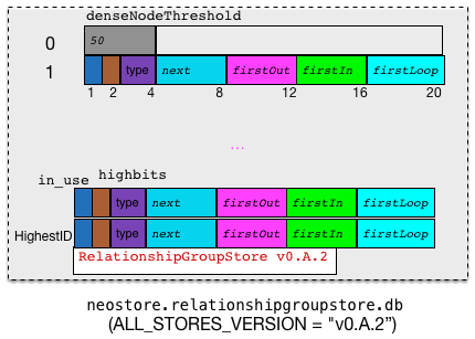 整个文件是有一个 RECORD_SIZE=20Bytes 的定长数组和一个字符串“RelationshipGroupStore v0.A.2”(文件类型描述TYPE_DESCRIPTOR和 neo4j 的 ALL_STORES_VERSION构成)。访问时,可以通过 id 作为数组的下标进行访问。数组下标为0的 record 前4 Bytes 保存Relationship分组的阀值。
