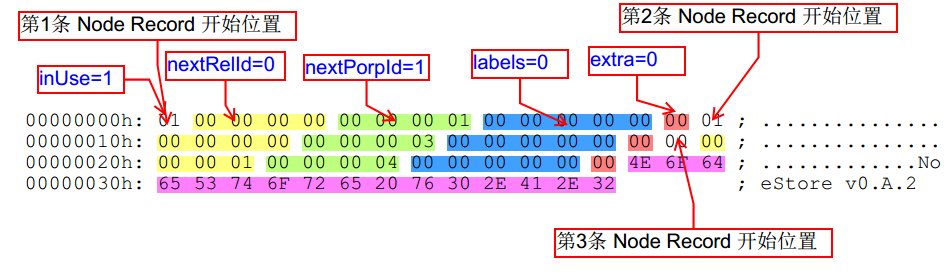 从neo4j_exam的neostore.nodestore.db文件内容可以看到,文件中保存了有 3 条node record 几率的数组和一个字符串“NodeStore v0.A.2”(文件类型描述TYPE_DESCRIPTOR和 neo4j 的 ALL_STORES_VERSION构成)。