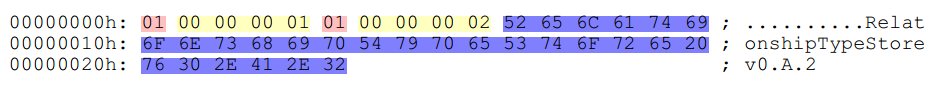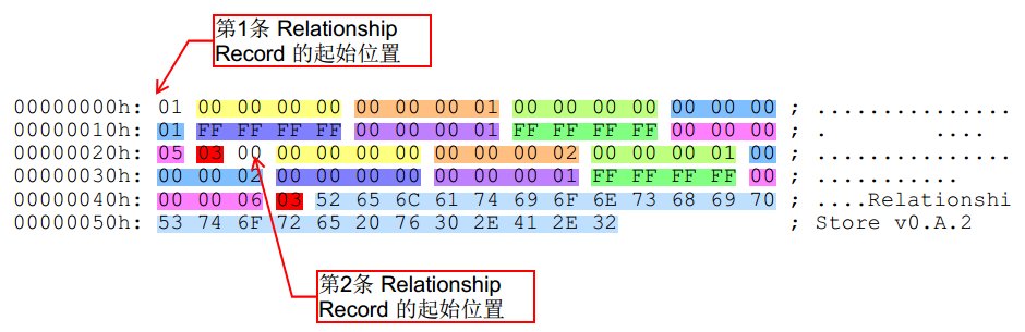ArrayPropertyStore的存储格式见< 3.3.2 DynamicStore 类型>,下面分别介绍一下RelationshipTypeTokenStore, RelationshipStore和RelationshipStore的文件存储格式。