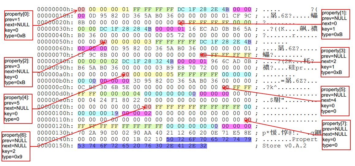 为了看文件的内容,笔者用二进制方式打开neo4j_exam的db存储文件,并用虚拟打印机输出到pdf 文件,并根据每个文件的格式,进行了着色。
