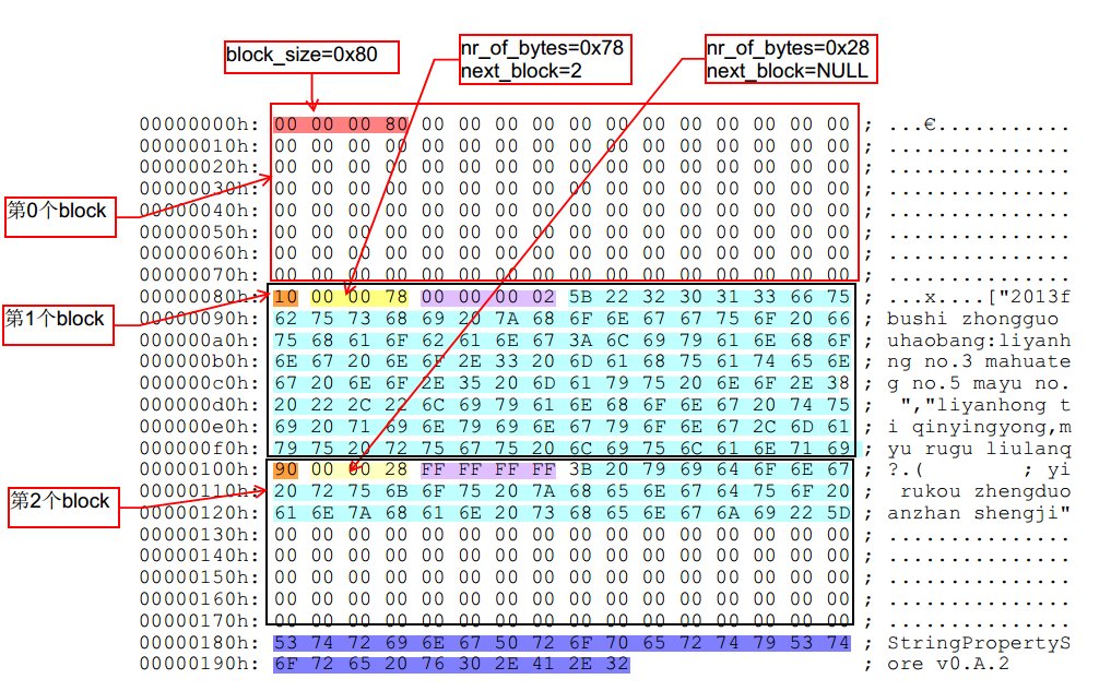 - 第1个block 的保存例子中关系relationship的属性值一部分: < [“2013fubushi zhongguo fuhaobang:liyanhong no.3 mahuateng no.5 mayu no.8 “,”liyanhong tui qinyingyong,mayu rugu liulanq >, 其中 block_header的值如下:link_block=0, in_use=1, nr_of_bytes=0x78 , next_block=2