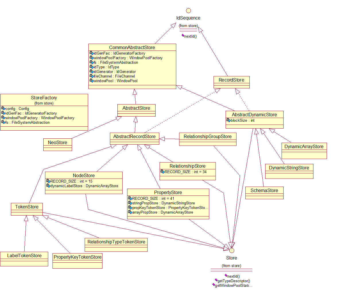 3.1.1 CommonAbstractStore.javaCommonAbstractStore 是所有 Store 类的基类,下面的代码片段是 CommonAbstractStore 的成员变量,比较重要的是飘红的几个,特别是IdGenerator,每种Store 的实例都有自己的 id 分配管理器; StoreChannel 是负责Store文件的读写和定位;WindowsPool 是与Store Record相关的缓存,用来提升性能的。
