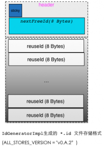 id 文件的header 部分: sticky 值是0, nextFreeId是3,目前已回收可复用的 ID 是 02。