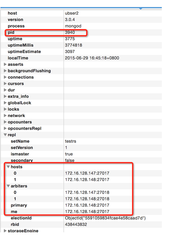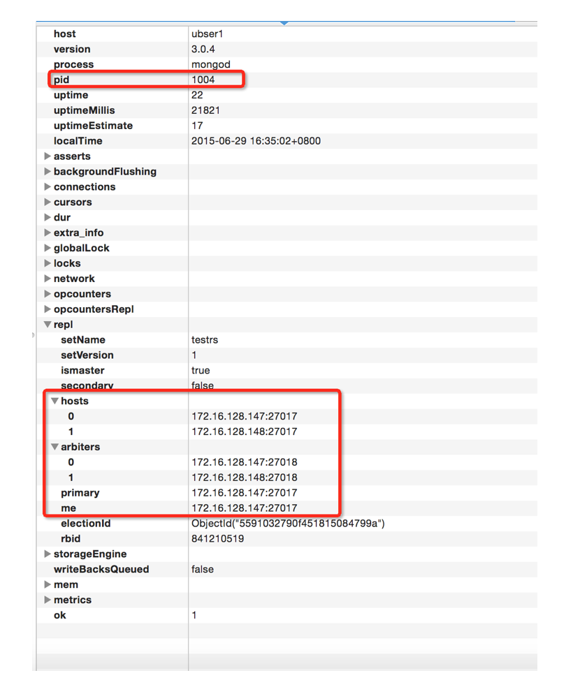 这个时候可以通过: >rs.status() 命令来查看集群的状态