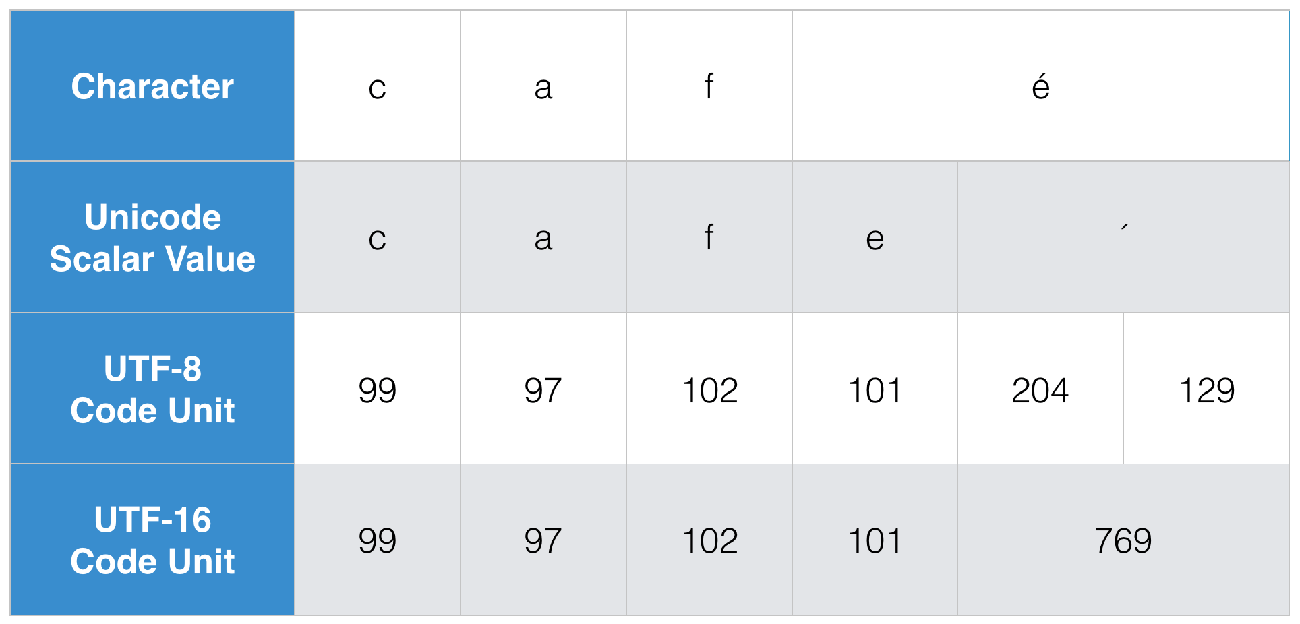 characters属性表示的是扩展字元簇.它与用户所直观看到的字符是相近的(由c,a,f,é四个字符组成).这是因为一个字符串必须能迭代整个串中的每一个位置(每一个位置都被成为一个代码点(code point)),以便能在O(n)时间复杂度上执行存取该属性的操作,并获取字符串的边界.当处理一个包含了人类可读的文字或者高度地域敏感的Unicode编码算法,比如用作localizedStandardCompare(_:)方法的入参或者localizedLowercaseString属性的值的时候,应该使用这种逐个字符的处理方式.unicodeScalars属性暴露了字符串中基本Unicode纯量的存储.当一个原始的字符串是由预组合字符( precomposed character)é组成,而不是由分解成的两个字符e+´组成,那么你应该更倾向于使用这个API来进行更底层的字符串数据的操作.utf8和utf16属性分别被用来提供UTF-8与UTF-16的代码点的操作.这些值通常被用于在写入真正的文件系统的时候转换成某些特定的编码.UTF-8编码通常被用作许多POSIX字符串API的处理.而UTF-16则是更多的用于Cocoa&Cocoa Touch框架,以计算字符串的长度与偏移量.