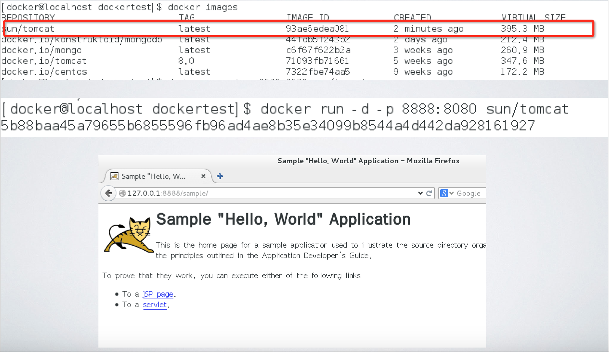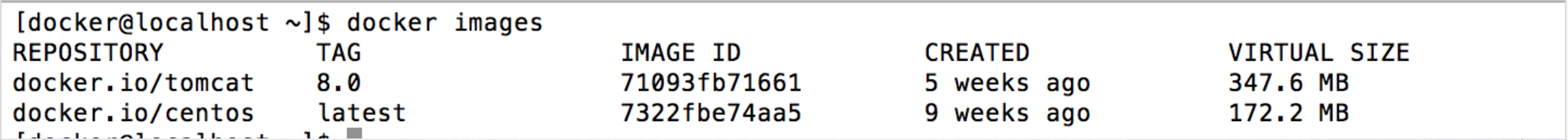 它显示了当前有两个镜像,分别是什么,从哪下载的,镜像GUID是什么,大小是什么等等 - 从镜像中启动一个新的tomcat容器