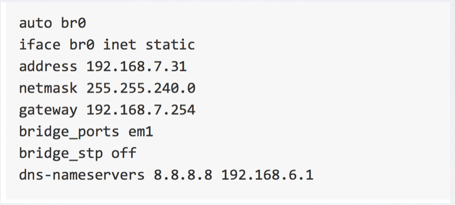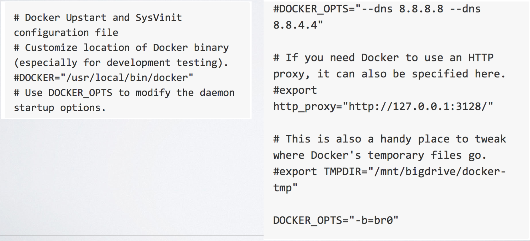 将Docker的默认网桥绑定到这个新建的br0上,这样就将这台机器上容器绑定到em1这个网卡所对应的物理网络上了.