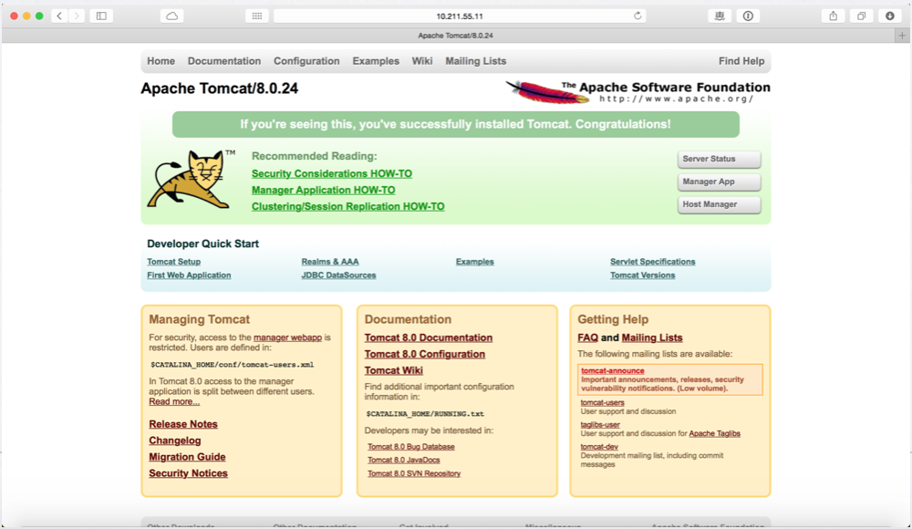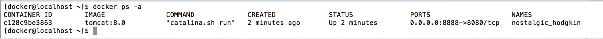 表示了容器的GUID,镜像名字,执行命令,创建时间,状态,端口映射,容器名字等等 - 这个时候就已经可以在浏览器中通过宿主机IP和端口8888来访问tomcat8的容器了.这样在一个什么都没有安装的新机器上,其实很简单的就完成了tomcat的安装.这就是docker的优势