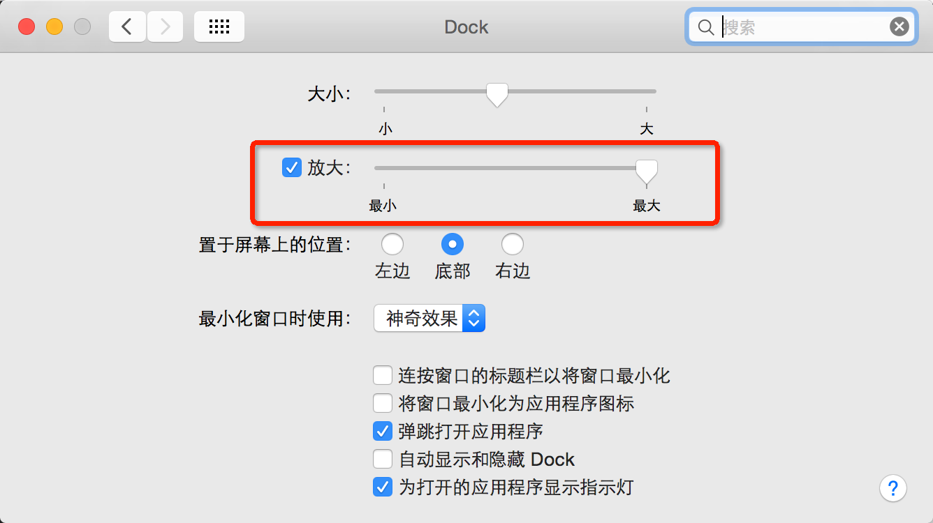 由于使用的程序比较多,所以Docker上有一堆的图标,自然每一个图标就比较小,因此需要把自动放大的功能给打开.而且也不能放到屏幕的左右两边,否则就会小的没法看…