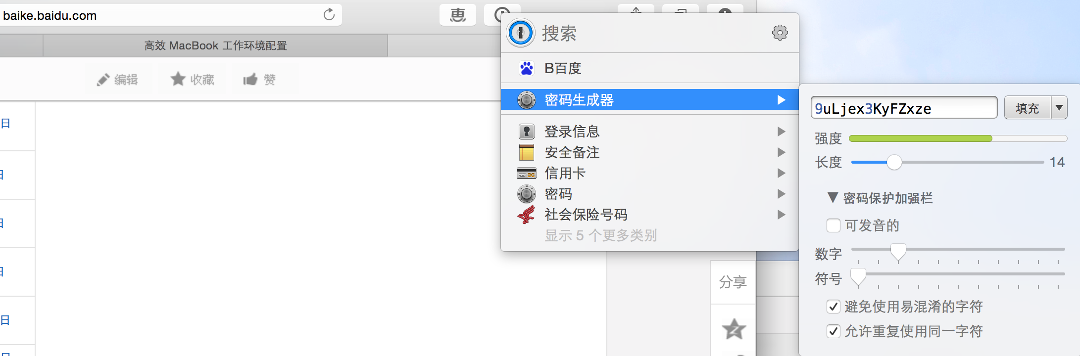 这个又是一个神器,他可以帮你保存所有的密码.这样你只需要记住一个密码就可以了,其他的密码都交由它来保存.它同时有safari和chrome的插件,以及IOS端的程序.通过加密了的文件使用iCloud进行同步,没有中心的服务器.自从CSDN被拖库而被泄露了一堆密码以后,我就开始使用这个软件,把我所有的账号都通过它设置成14位的不同的随机密码,这样减少了一个密码泄露,全部玩完的情况.要说这个软件的缺点,那就是卖的有点贵,300多一个好像.不过我觉得还是值了.(网上到是有这个的破解软件,但是如果真想使用这个软件,我建议还是买正版吧.一个用来保存密码的软件使用破解的,我怕里面的密码也一起被”破解”了..)
