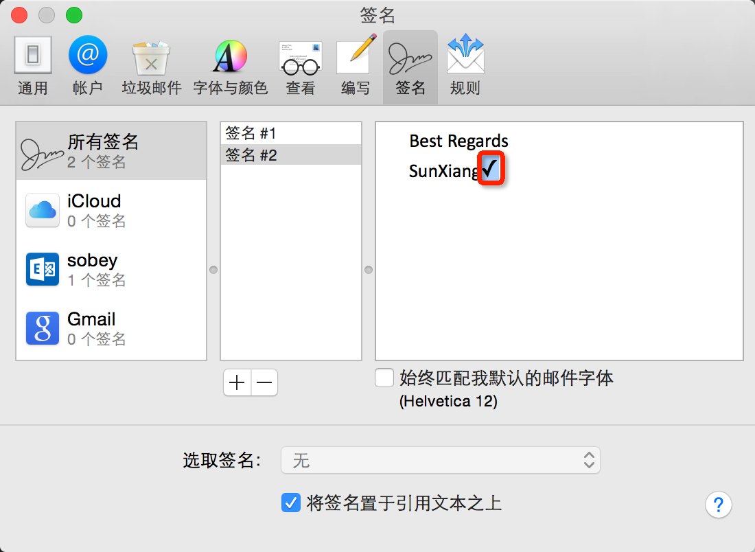需要注意的是,最好在Mail程序中设置一个你的签名.并且在签名中增加一个Unicode的字符.这样在发送邮件的时候,Mail会把你的邮件使用UTF-8的格式来传送,这样Win端的一些工具收到后就不会有乱码的问题.