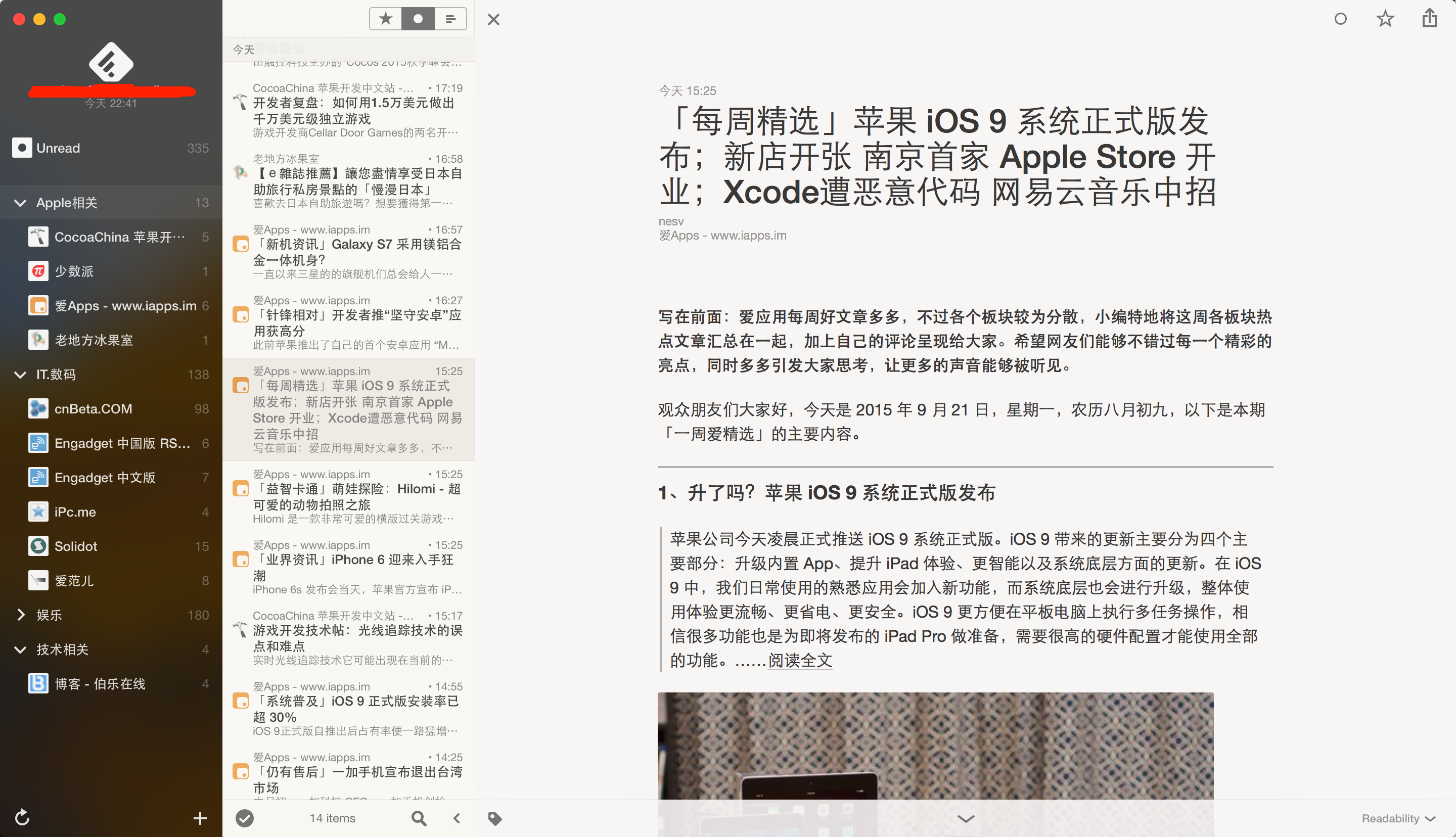 这个是目前最好用的RSS阅读软件了.他可以订阅各种的来源,自从google的死了后,现在我使用的是Feedly提供的服务.还算稳定可靠.同样提供了IOS端的程序,两个间可以进行同步.虽然现在都在说RSS已经过时了,但是我觉得RSS还能活跃很久,毕竟这种订阅的信息收集其实是很高效和有用的.
