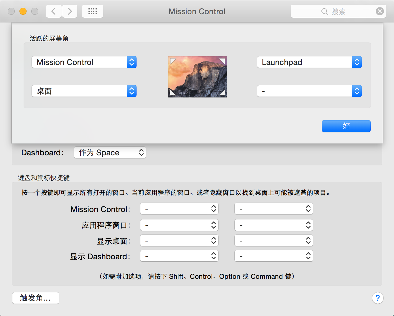 我一般都是把左下角设置为显示桌面,左上角设置为MissionControl,右上角设置为Launchpad