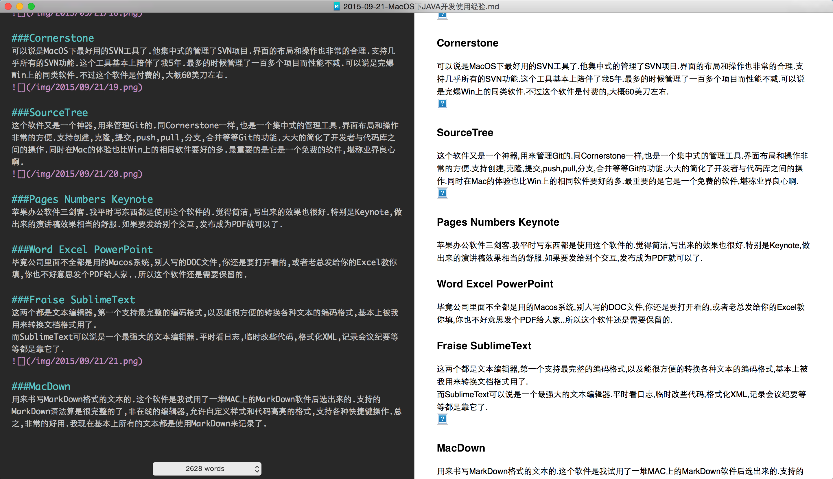用来书写MarkDown格式的文本的.这个软件是我试用了一堆MAC上的MarkDown软件后选出来的.支持的MarkDown语法算是很完整的了,非在线的编辑器,允许自定义样式和代码高亮的格式,支持各种快捷键操作.总之,非常的好用.我现在基本上所有的文本都是使用MarkDown来记录了.