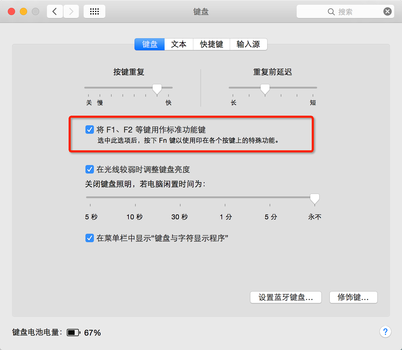 不知道是出于什么原因,MacOS系统刚装上的时候,键盘最上面的一排F1,F2的按钮是音量键这些.这完全就没法用嘛.所以必须设置成为标准的F1 F2功能. 这个只需要在设置-键盘 里面设置即可.