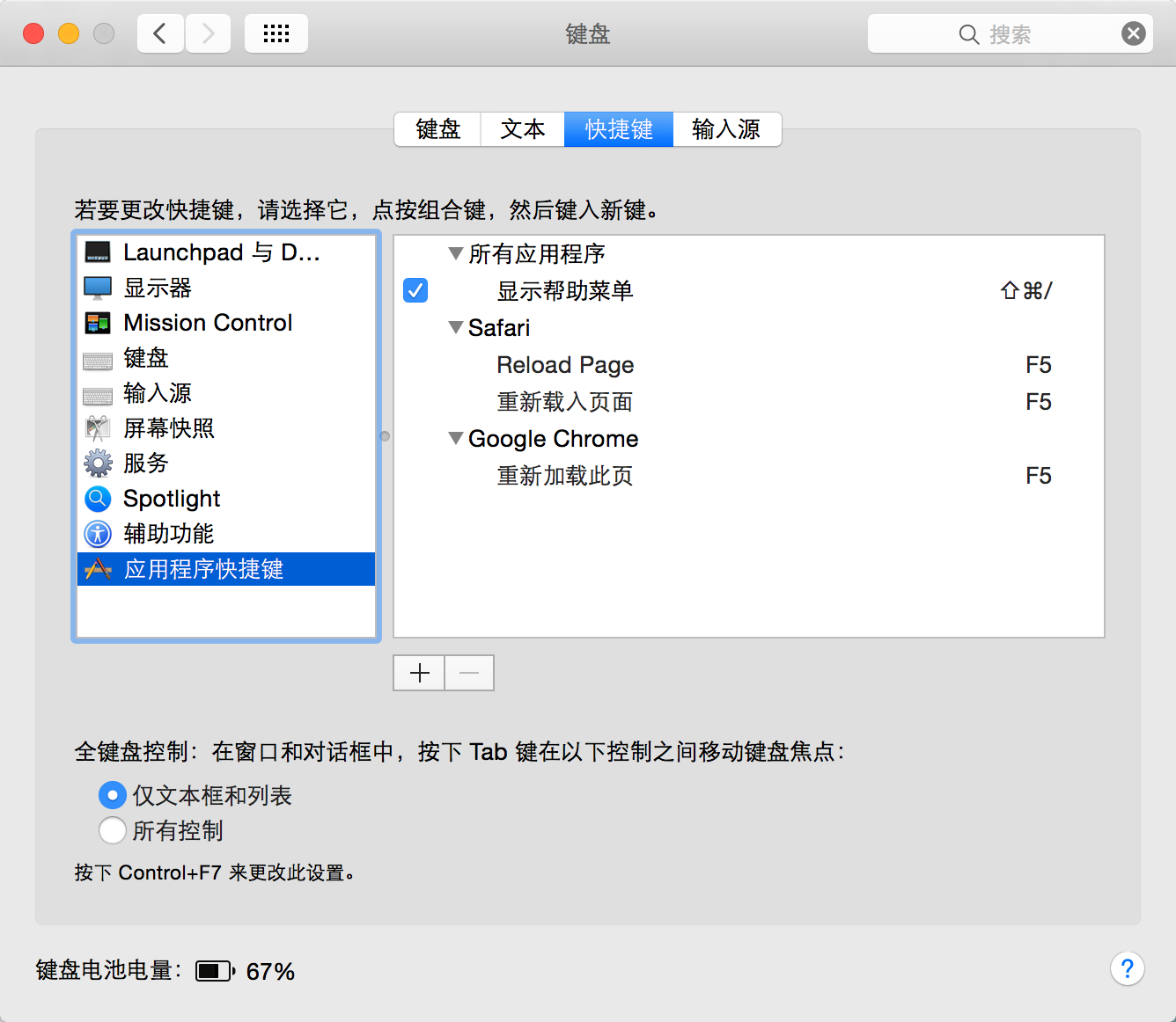 在默认的情况下,Safari和Chrome都没有提供F5刷新页面的功能.这让我们在浏览网页或修改页面的时候很难受,因此需要增加上这些快捷键. 这在设置-键盘-快捷键中设置.