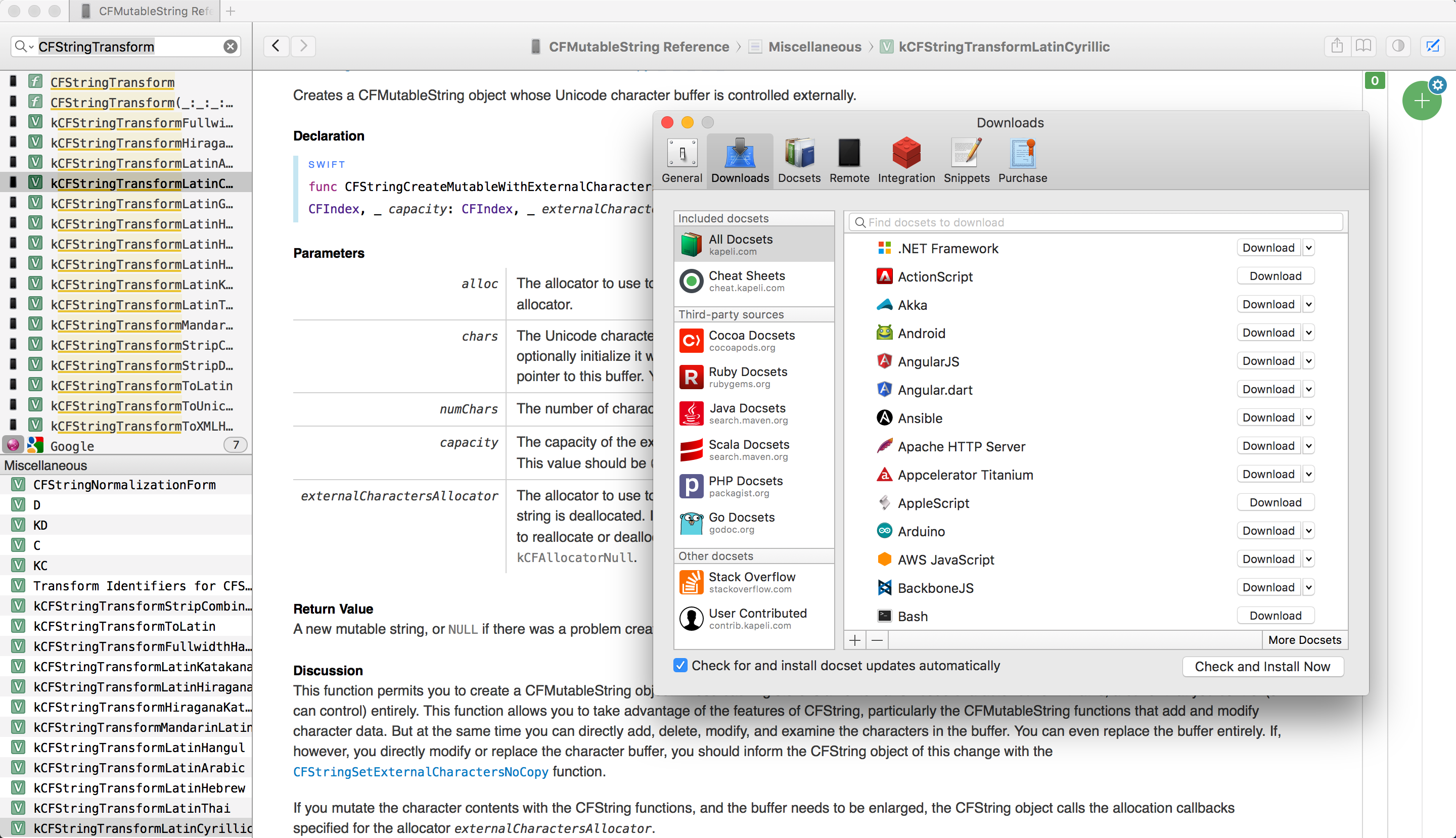 这个又是Mac Only的一个福利,是一款功能单一却精准的API文档浏览器,以及代码片段管理工具.它采用了单窗口的模式,最方便的提供了API查询的需求.我们平时写东西的时候,最常用的就是查看源码和API了,IDE提供了源码的查看,而Dash则提供了API查询的功能. 它可以和绝大多数的IDE合作,包括我们JAVA最常用的Intellij eclipse.只需要在需要查看API的代码上按住Command+Shift+左键(这个可以自己设置),那么就会自动的跳转到它的界面上并显示这段代码的API.不需要我们到处去翻了.