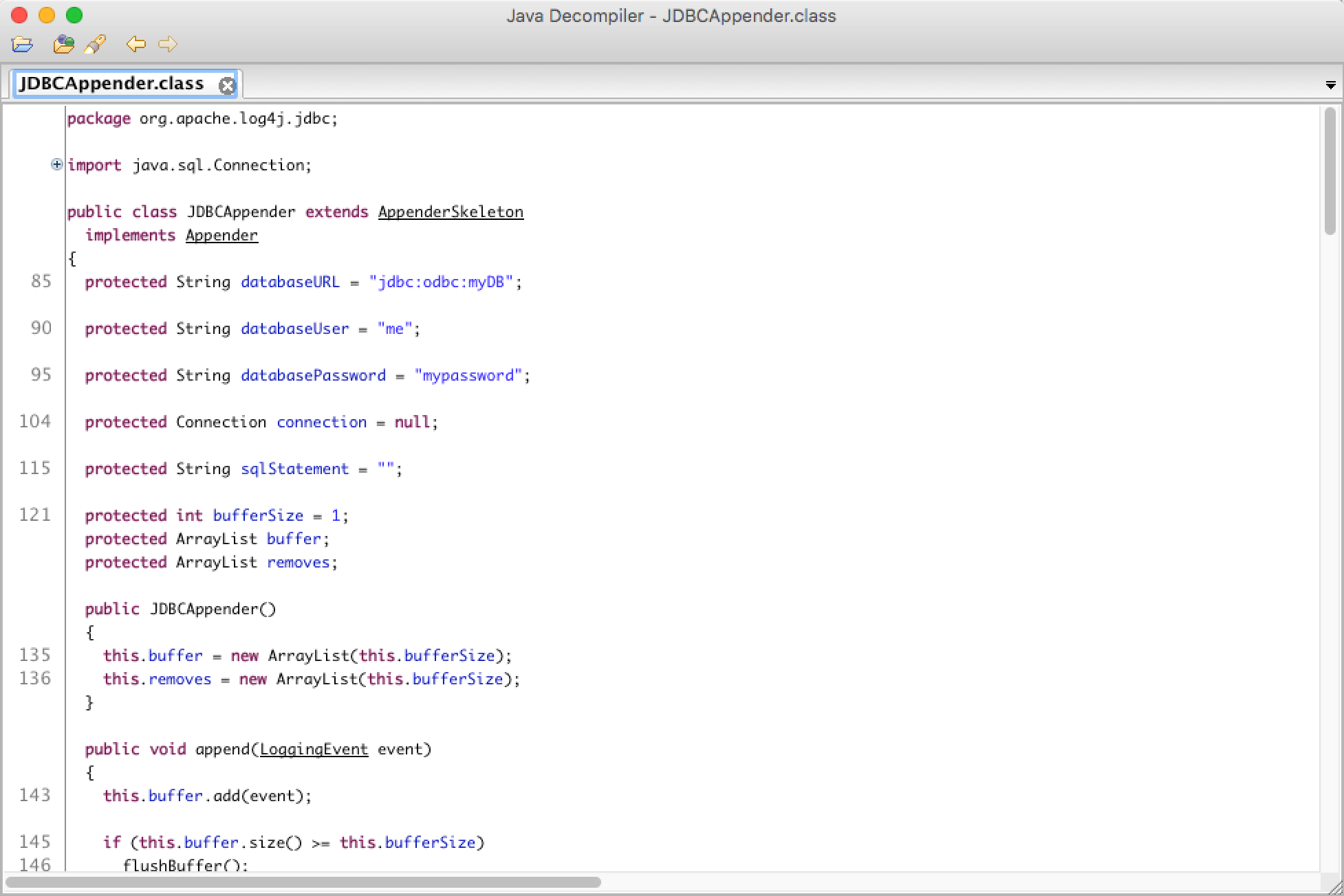 这个是Mac下的可视化的Java反编译工具.使用很简单,直接双击打开界面后,把class文件或者文件夹直接拖入他的窗口就可以了.然后就会自动的反编译好,如果是一个文件夹的话,他还支持代码间的跳转.这对有些时候来说有奇效.