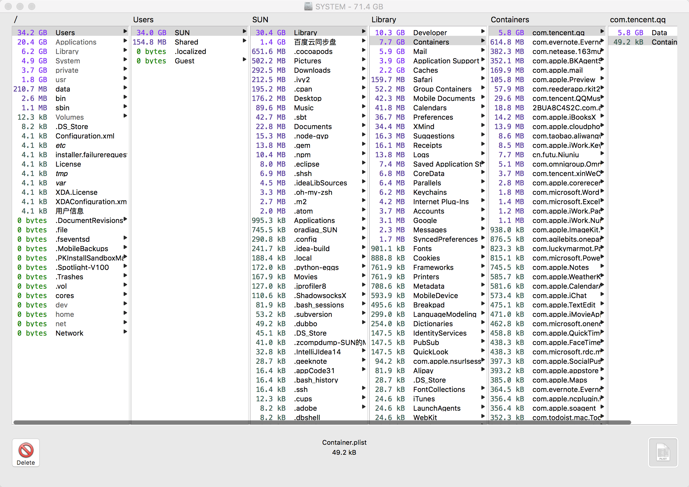 这个工具也是平时使用Mac必不可少的,主要是用来查看磁盘空间被什么文件使用的.通过这个软件可以很容易的看到你的磁盘到底是被什么占用了这么多.自从又一次无意间发现企鹅聊天占用了我系统盘10个G空间存放莫名其妙的东西后,我就养成了定时执行一次这个软件的习惯,谁叫我们是屌丝只买得起256G的SSD喃..空间还是要节约到用..