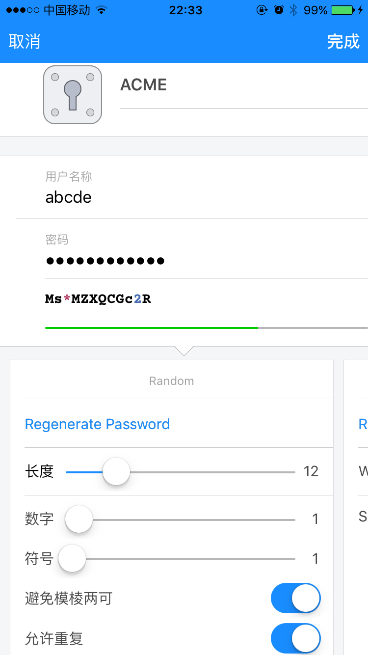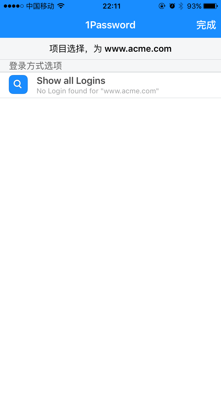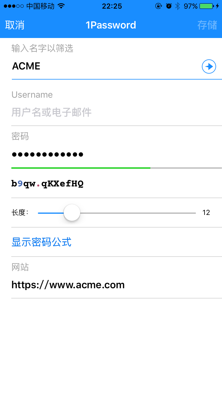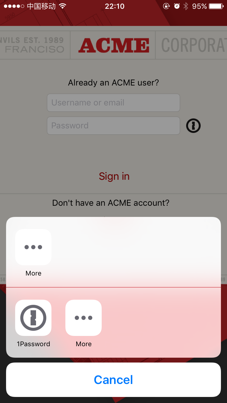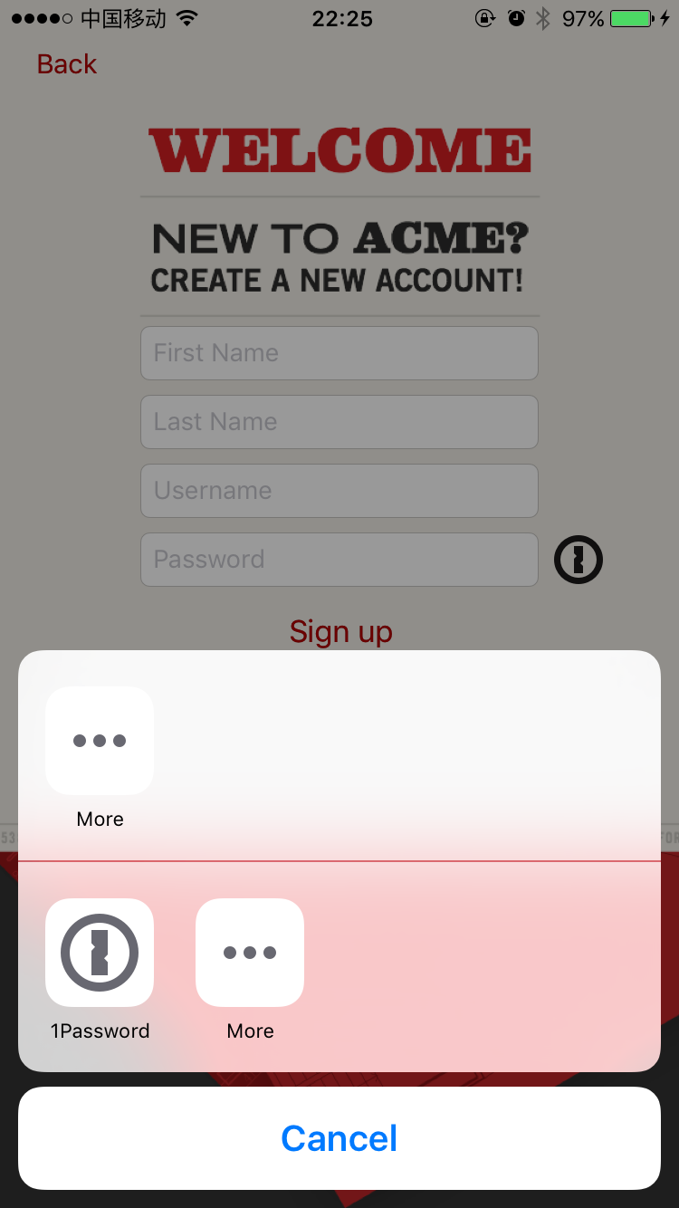 public func storeLoginForURLString(URLString: String, loginDetails loginDetailsDictionary: [NSObject : AnyObject]?, passwordGenerationOptions: [NSObject : AnyObject]?, forViewController viewController: UIViewController, sender: AnyObject?, completion: (([NSObject : AnyObject]?, NSError?) -> Void)?)方法12345678910111213141516171819202122232425262728293031323334353637383940414243444546474849//构造1Password新注册用户页面的一些信息let newLoginDetails:[String: AnyObject] = [AppExtensionTitleKey: "ACME",AppExtensionUsernameKey: self.usernameTextField.text!,AppExtensionPasswordKey: self.passwordTextField.text!,AppExtensionNotesKey: "Saved with the ACME app",AppExtensionSectionTitleKey: "ACME Browser",AppExtensionFieldsKey: ["firstname" : self.firstnameTextField.text!,"lastname" : self.lastnameTextField.text!// Add as many string fields as you please.]]//设置密码生成规则let passwordGenerationOptions:[String: AnyObject] = [// 密码最小长度AppExtensionGeneratedPasswordMinLengthKey: (8),// 最大密码长度AppExtensionGeneratedPasswordMaxLengthKey: (30),// 是否必须包含数字AppExtensionGeneratedPasswordRequireDigitsKey: (true),// 字符必须包含符号AppExtensionGeneratedPasswordRequireSymbolsKey: (true),// Here are all the symbols available in the the 1Password Password Generator:// !@#$%^&*()_-+=|[]{}'\";.,>?/~`// The string for AppExtensionGeneratedPasswordForbiddenCharactersKey should contain the symbols and characters that you wish 1Password to exclude from the generated password.//生成密码的时候排除的字符AppExtensionGeneratedPasswordForbiddenCharactersKey: "!@#$%/0lIO"]//调用1Password,打开它的页面输入用户注册信息OnePasswordExtension.sharedExtension().storeLoginForURLString("https://www.acme.com", loginDetails: newLoginDetails, passwordGenerationOptions: passwordGenerationOptions, forViewController: self, sender: sender) { (loginDictionary, error) -> Void inif loginDictionary == nil {if error!.code != Int(AppExtensionErrorCodeCancelledByUser) {print("Error invoking 1Password App Extension for find login: \(error)")}return}//把用户输入的注册信息返回给界面组件self.usernameTextField.text = loginDictionary?[AppExtensionUsernameKey] as? Stringself.passwordTextField.text = loginDictionary?[AppExtensionPasswordKey] as? Stringself.firstnameTextField.text = loginDictionary?[AppExtensionReturnedFieldsKey]?["firstname"] as? Stringself.lastnameTextField.text = loginDictionary?[AppExtensionReturnedFieldsKey]?["lastname"] as? String}效果如图: