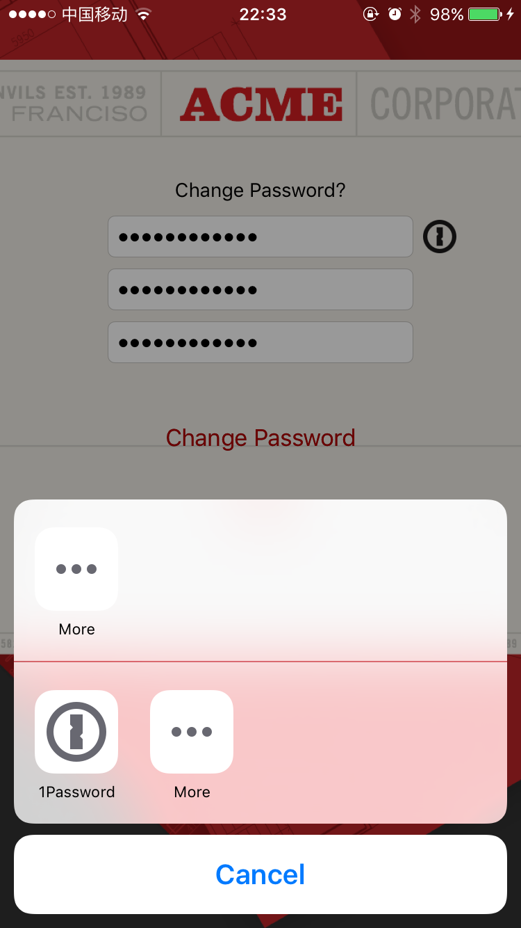 public func changePasswordForLoginForURLString(URLString: String, loginDetails loginDetailsDictionary: [NSObject : AnyObject]?, passwordGenerationOptions: [NSObject : AnyObject]?, forViewController viewController: UIViewController, sender: AnyObject?, completion: (([NSObject : AnyObject]?, NSError?) -> Void)?)12345678910111213141516171819202122232425262728293031323334353637383940414243//构造1Password修改密码页面的一些信息let newLoginDetails:[String: AnyObject] = [AppExtensionTitleKey: "ACME", // Optional, used for the third schenario onlyAppExtensionUsernameKey: "aUsername", // Optional, used for the third schenario onlyAppExtensionPasswordKey: changedPassword,AppExtensionOldPasswordKey: oldPassword,AppExtensionNotesKey: "Saved with the ACME app", // Optional, used for the third schenario only]//设置密码生成规则let passwordGenerationOptions:[String: AnyObject] = [// 密码最小长度AppExtensionGeneratedPasswordMinLengthKey: (8),// 最大密码长度AppExtensionGeneratedPasswordMaxLengthKey: (30),// 是否必须包含数字AppExtensionGeneratedPasswordRequireDigitsKey: (true),// 字符必须包含符号AppExtensionGeneratedPasswordRequireSymbolsKey: (true),// Here are all the symbols available in the the 1Password Password Generator:// !@#$%^&*()_-+=|[]{}'\";.,>?/~`// The string for AppExtensionGeneratedPasswordForbiddenCharactersKey should contain the symbols and characters that you wish 1Password to exclude from the generated password.//生成密码的时候排除的字符AppExtensionGeneratedPasswordForbiddenCharactersKey: "!@#$%/0lIO"]//调用1Password,打开它的页面输入密码修改信息OnePasswordExtension.sharedExtension().changePasswordForLoginForURLString("https://www.acme.com", loginDetails: newLoginDetails, passwordGenerationOptions: passwordGenerationOptions, forViewController: self, sender: sender) { (loginDictionary, error) -> Void inif loginDictionary == nil {if error!.code != Int(AppExtensionErrorCodeCancelledByUser) {print("Error invoking 1Password App Extension for find login: \(error)")}return}//把用户的修改返还给界面self.oldPasswordTextField.text = loginDictionary?[AppExtensionOldPasswordKey] as? Stringself.freshPasswordTextField.text = loginDictionary?[AppExtensionPasswordKey] as? Stringself.confirmPasswordTextField.text = loginDictionary?[AppExtensionPasswordKey] as? String}效果如图: