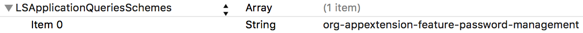 1Password程序,按钮才出现的话.可以调用view?.onePasswordButton.hidden = !OnePasswordExtension.sharedExtension().isAppExtensionAvailable().这个方法会判断系统中是否有应用程序能处理org-appextension-feature-password-management这个特性.如果有程序可以执行,那么就返回true. 需要注意的是:在IOS9中你需要给Info.plist文件中增加一行记录: