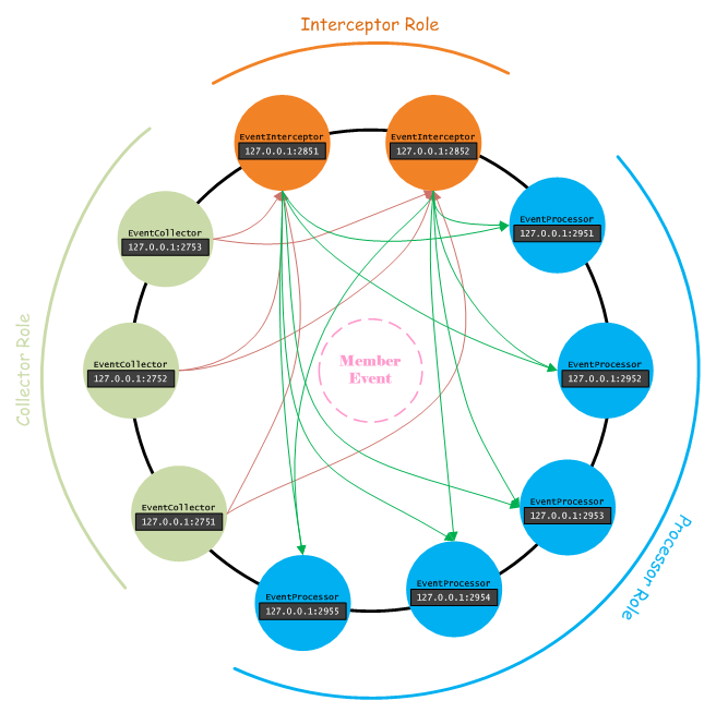 在上图中,将日志处理系统分为了3个子部分,通过Akka的Role来进行划分,3个角色分别为collector收集器,interceptor拦截器,processor处理器,3个子系统中的节点都是整个Akka集群中的成员.整个集群系统的数据流向是:collector接收数据,然后将数据发送到interceptor,interceptor接收到数据后,解析出真实IP地址,拦截存在于黑名单中的IP请求,如果IP地址不在黑名单,则发送给processor去转换为最终的模型,然后保存到Kafka中.